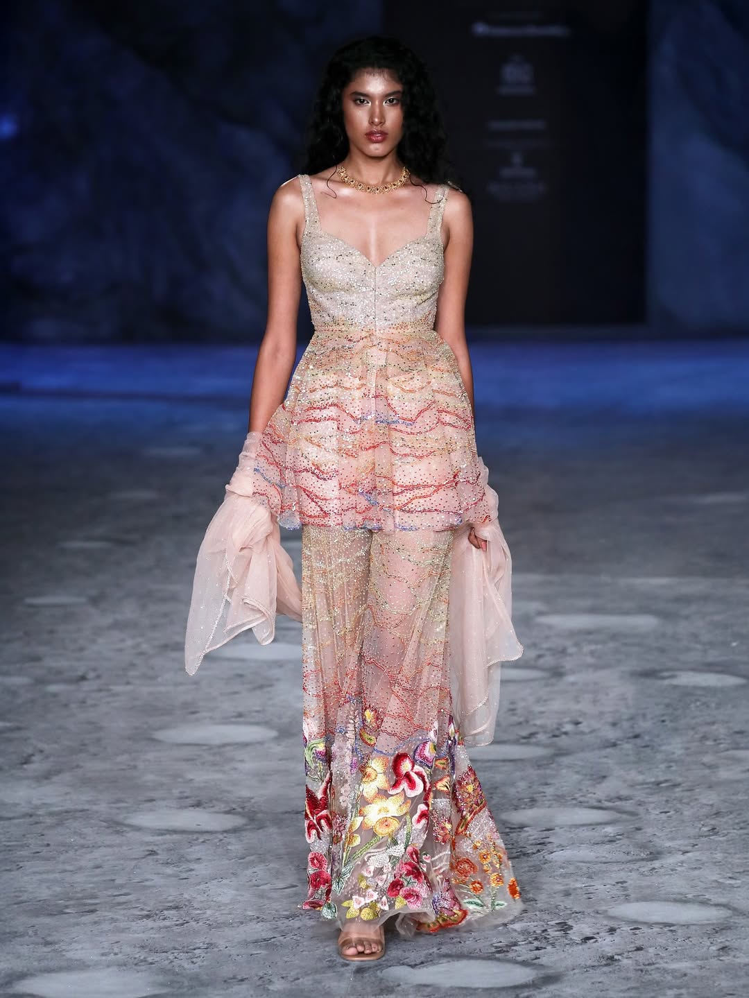 Jayanti Reddy’s Reclaimed Opulence dazzled with a craft-centric narrative, celebrating the charm of antique textiles through intricate dori work, ornate florals, paisleys and baroque motifs. The silhouettes shimmered with the designer’s signature lavish embroidery and sequins detailing.