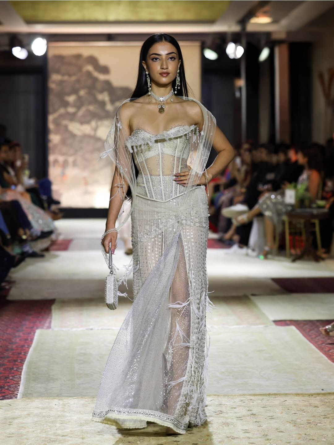 Roseroom by Isha Jajodia opened with Whispers of Love to Myself, a collection that explored femininity through the lens of self-love, transformation, and empowerment. Divided into four chapters from innocence to self-actualisation, it featured soft pastels, sculpted corsets, sweeping capes, veils, feathered skirts, and unembellished lace – a subtle yet recurring motif.