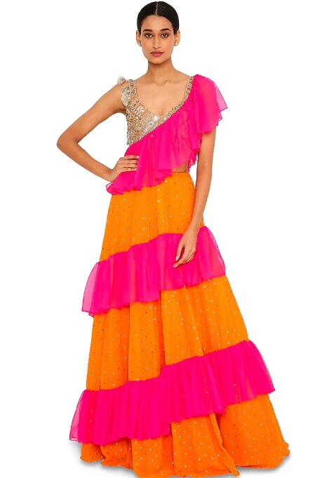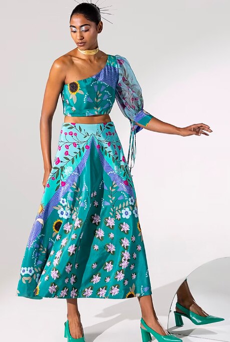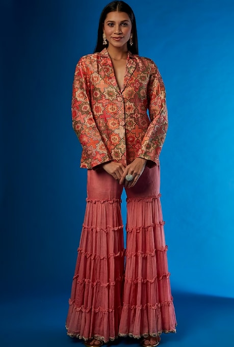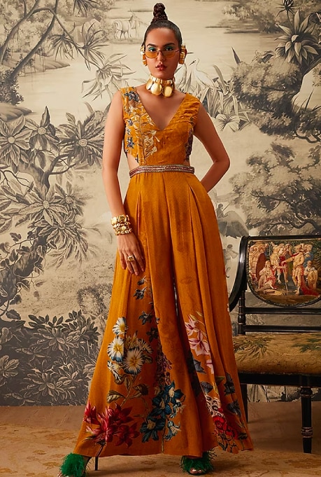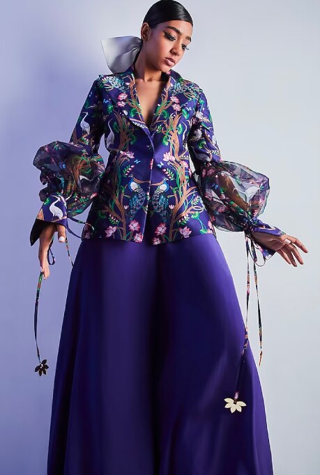 At the heart of Gopi Vaid, a much sought-after label, beats the rhythm of creative flair and artistic expression of its designer duo. Their exquisite occasion wear harmonises rich hues, understated patterns, and intricate embroidery, resulting in effortlessly chic designs that possess timeless allure. The label brings forth innovative combinations like peplum tops paired with dhoti skirts, ruffled sarees complemented with embroidered blouses and collared jackets with high-waisted pants. With a wide array of fashion-forward options, Gopi Vaid empowers fashion enthusiasts to accessorise and personalise their looks for any occasion.
