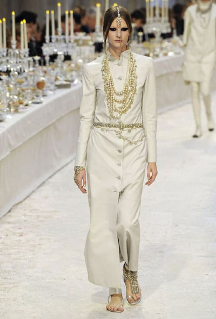 Chanel’s 2012 Paris-Bombay Métiers d’Art show indulged in a lavish reimagining of Indian royalty. The collection featured saree-inspired drapes, Nehru collars, and jewellery like maang tikkas, statement necklaces, and handcrafted bags with glimmering accents that evoked the opulence of Indian Maharajas.