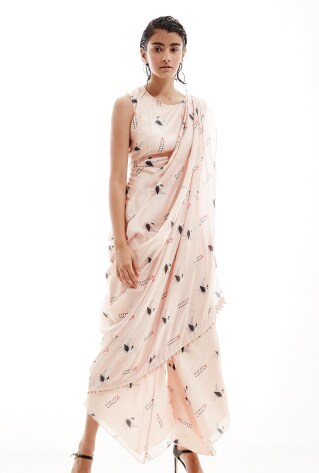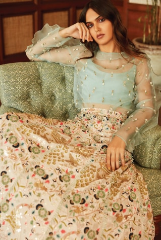 Arya by SVA spins the saree in a refreshing new way while honouring the quintessential drape with a stylized update. The dainty graphic prints of flora and fauna primp up the soft pastel hue exquisitely. Don it to a pre-nuptial luncheon flaunt your elan.