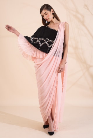 While going desi is the easiest way to garner social media stardom, a fusion twist will only attract more attention! This concept saree by Limerick comes with a one-shoulder cape that is simply wow-worthy for a reception-cum-cocktail soirée.