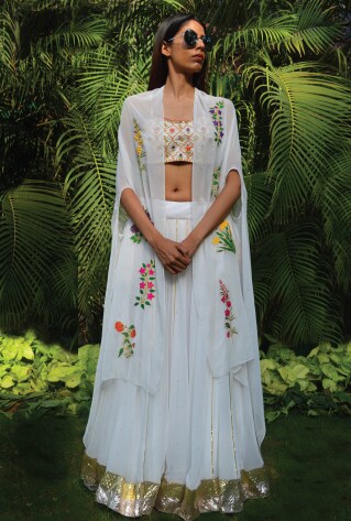 It’s simply dreamy how floral ornate looks on a canvas of translucent white fabric. Ayinat by Tanya O’Connor makes case for a perfect mix of glamour and nonchalance with this cape-paired lehenga. Don it for daytime merriments and take the internet by storm with your stylish snaps.
