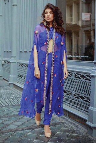 Whether #OutfitOfTheDay or #OutfitOfTheNight, this royal blue ensemble by Tisha Saxena will make you the cynosure of all eyes. With masterfully draped bustier, dhoti pants and cape, here’s a fusion masterpiece you’ll love striking poses in.