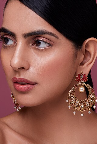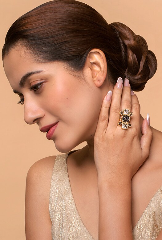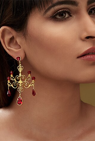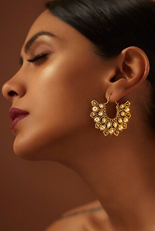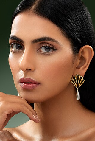 Defined by European architectural intricacies of the 17th to 19th century, Eina Ahluwalia’s ‘Fe’ collection features pops of jewels offsetting the sleek golden carvings. Chandelier dangler earrings, vine maangtikas and rings, the myriad of artsy motifs are noteworthy at first glance. Mainstays of a minimalists closet, these are styles you’ll repeat for evening soirées!