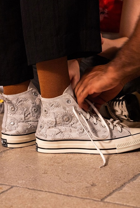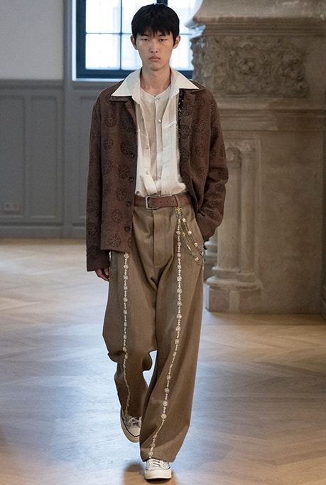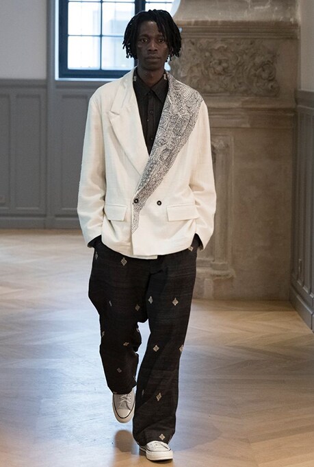 His debut at Paris Fashion Week last season, in collaboration with the iconic UK label Baracuta, showcased an eclectic mix of patchworks, handwoven textiles, and floral embroideries. This collection also introduced his first womenswear line, featuring exclusive embellished Converse sneakers.