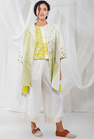 Striking neon hand block prints are placed cleverly highlighting the simple oversize silhouettes into statement pieces in Yavi‘s khadi collection. The off-beat shapes encourage the wearer to invent an individualistic style. A failsafe approach to find a leeway from conventional dress codes, perhaps at work.