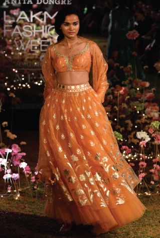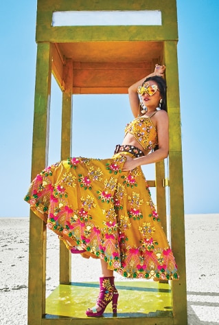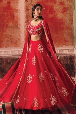 Papa Don’t Preach presented chic cropped versions of lehengas and the trend has officially taken over. The rendition imagines couture with casual comfort and the style is bound to catch attention the moment you enter the room. The ankle-grazing length boasts a futuristic charm and is all about revelling festive frolics sans any fuss. Choose a midi lehenga for a groovy sangeet night to add a playful vibe.