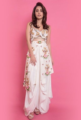 Fusion styles are going big this season so look no further to jump onto the bandwagon. Nushrat Bharucha’s look in Papa Don’t Preach will sure-fire appeal to the millennial in you. The drapes, cut-out details and eccentric embellishments make it a perfect pick Diwali taash party.