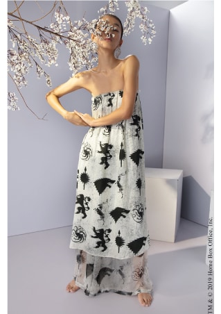 The Masaba x Game of Thrones collection is an ode to the magnanimous show and is centred around the Stark family of the North. Capturing the spirit of the show and the characters, the collection is an amalgamation of medieval and modern aesthetics with a contemporary take on the fantasy opulence. The theme of the show comes across through prints and elements that remind us of the throne, the sigils, quotes and phrases and the essence of the show: Winter.