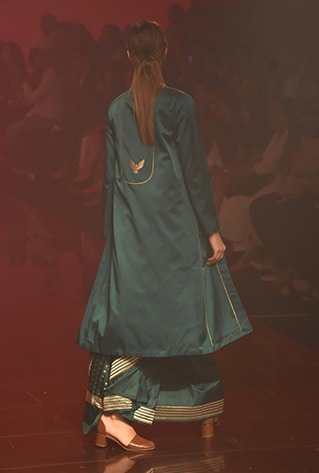“Moulin Rouge is inspired by the Jazz age and art deco of the ’20s and ’30s. Unlike my earlier collections, Brocades are only a part of this collection. The collection features highly stylized garments with the influence of architecture, a hint of statement embroidered motifs (notice the embroidered eagle) and about seven to eight prints including gold leaf printing.”