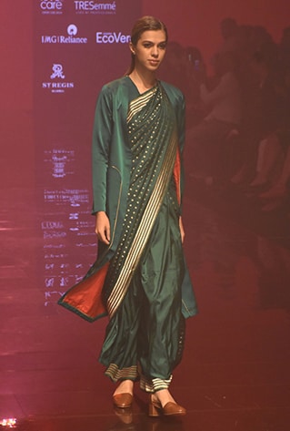 Kshitij Jalori showcased his collection titled ‘Moulin Rouge’ at Lakmé Fashion Week, on the 23rd of August. The collection where modern views met traditional weaves, included contemporary silhouettes for the modern woman. The architectural details of the Art Deco movement came through the intricate embroidery and surface textures. The deep colours of the collection portrayed the Jazz age in all its glitz and glamour. Jalori’s magnificent and distinct collection will surely be perfect for every fashionista’s closet.