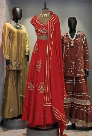 “Our creations of fun & flirty silhouettes bring to life our interpretation of the new age Indian Bride and her entourage. The garments flow depicts fluidity and flexibility of the Modern Bride who embodies confidence to adorn modern day silhouettes. Her love for travel is reflected in her strong unique play of silhouettes. Strongly rooted in her traditions she stands for the balance between these two worlds.”