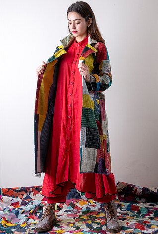 Doodlage is a blend of exclusive and sustainable high street fashion. Established in 2012 by Kriti Tula, it has put upcycling and patchwork at the heart of its designs. The brand creates limited edition collections from waste fabrics sourced from factories in Delhi. Aimed at being a zero-waste brand, Doodlage uses leftover materials to create accessories, furnishing products, and packaging. Their range includes patchwork in dresses, shirts, trench coats, jackets, pants and more, including menswear. The patchwork collection is not limited to clothes, the label also has a range of wallets, tote bags and journals.