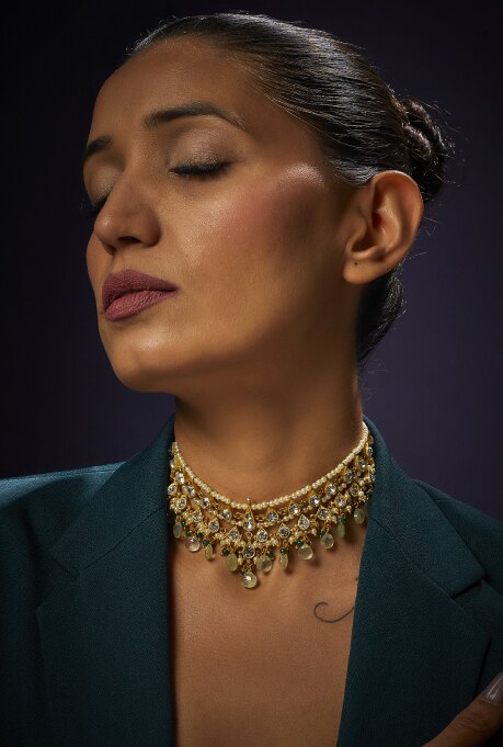 Time has proven that nothing quite beats the charm of heritage designs rooted in tradition. From auspicious festivities to weddings and post-wedding celebrations, traditional jewels are cherished for a lifetime. Instead of going for high-investment gold, opt for a gold-plated Kundan choker in 92.5 silver- like the one by AAHARYA. Set with pearls and green stones, this piece exudes a fluent harmony of modern and cultural elements. Pair it with exquisite polki jhumkas from KAARI and complete your wedding day look with ultimate grace and style. For your wedding trousseau, add more heritage pieces like kundan bangles that you can repeatedly return to.