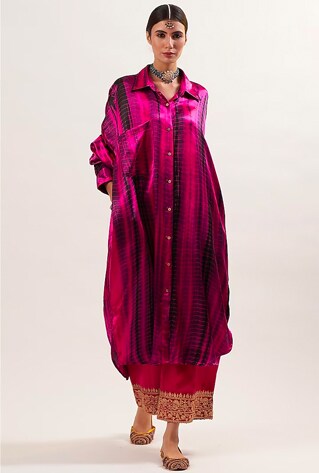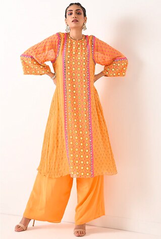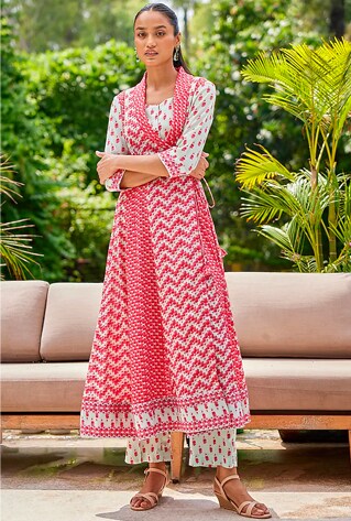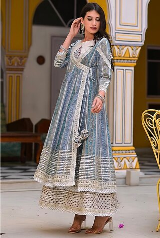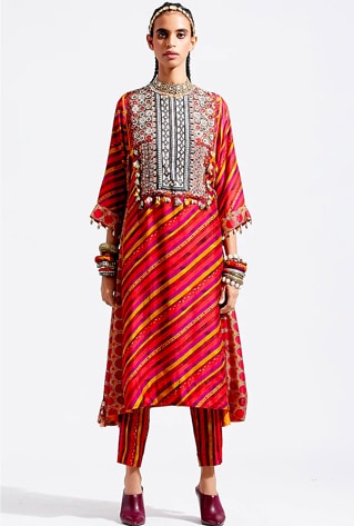 A sartorial look that has traveled ages, the choga and farshi set gives us a peek into the times of opulence. This long kurta from the 19th century and the bottom wear of the Begums of Awadh in the 17th century, the farshi pajama has been reprised in the festive segment. Pooja Rajgarhia Gupta gives the choga a nonchalant vibe with sorbet colours and light fabric, ideal for a temple visit. Similarly, Aseem Kapoor gave it a tribal-inspired charm with shells and fringes, to offset the bright stripes that can transition into a card party in the evening. Heena Kochhar’s pair of embroidered farshi pants can be invested in as a traditional possession that you can pass on.