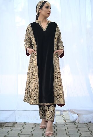 This native Kashmiri attire is enhanced with zari needlework or brocade accents on the yoke for an imperial appeal. Festive iterations of today range from quaint minimalistic to cosy up in a low-key affair to the styles exhibiting ingenious craftsmanship, making for a perfect choice for extravagant festive affairs. A contemporary spin on the 15th-century staple of Himalayan valleys, the tropical printed rendition by Sage Saga is an ideal option for a Diwali high-tea or hors d’oeuvre. Daljit Sudan taps into the heirloom’s originality by customising the ensemble in velvet with aari embroidered panels. Consider the look for conventional family rituals.