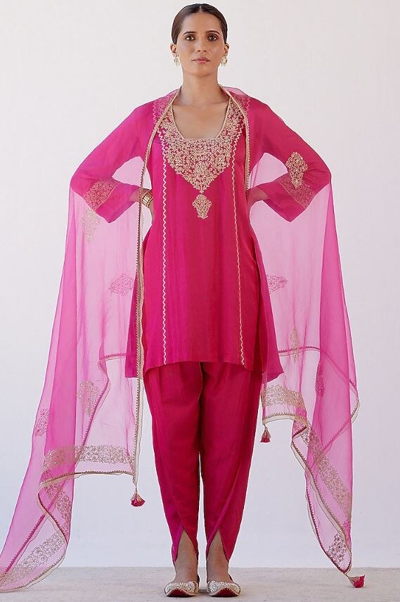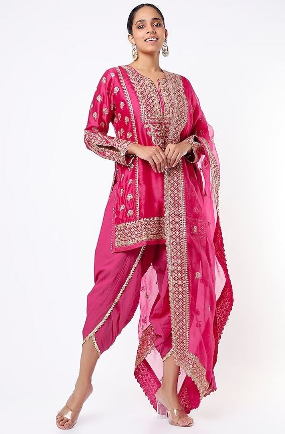 The nostalgia evoked by heirloom ensembles reinstates is a reminder of how some things remain unchanged even as the way of celebrating become unconventional. A kurta and dhoti ensemble can be deemed as an attire that reinstates a sense of revelry that is true to its roots. Gopi Vaid’s bright and blingy creation is refreshing yet culturally rooted look for Diwali festivities. Similarly, Devnaagri doesn’t let the dhoti look demure, pairing it with a meticulously embroidered kurta.