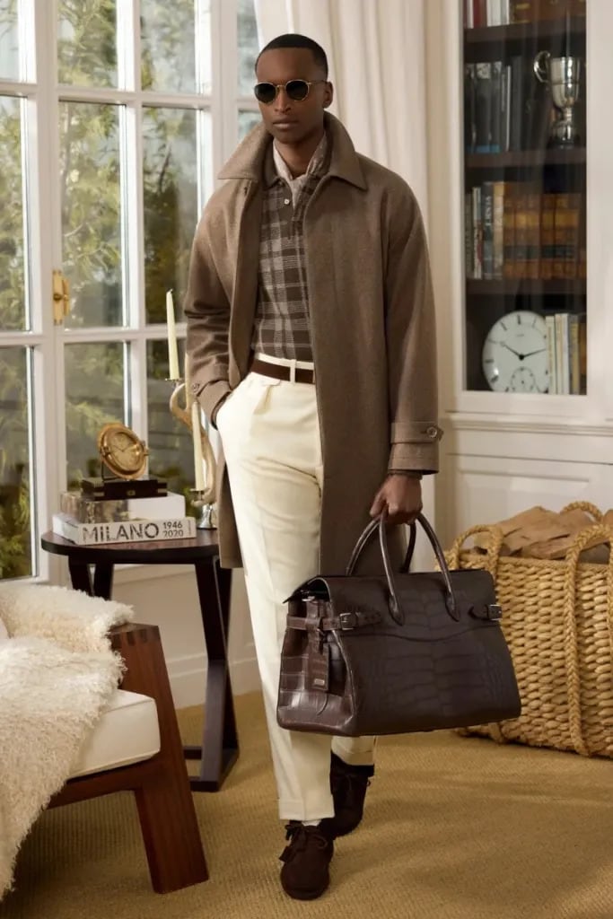 Daywear embraced a mood of rustic sophistication, with alpaca hunting coats, cashmere-lined puffer vests, and sports jackets patterned in horse-blanket checks. As the focus shifted to evening, the palette grew more polished: whip-stitched suede tailoring, richly textured jacquard dinner jackets, chunky hand-knit sweaters, zippered cotton-cashmere trousers, and crisp Sea Island cotton shirts, finished with statement belts.