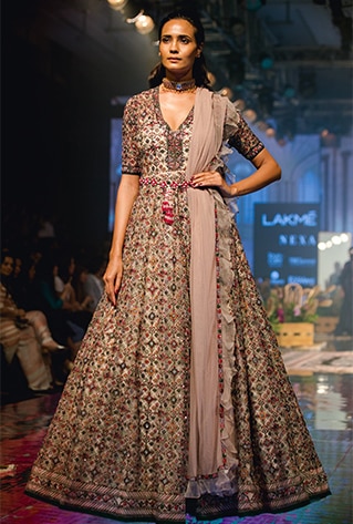 We got a chance to speak to her just after her show and she revealed what the collection means to her. “The collection is inspired by family heirlooms. We’ve taken influence from Kashmiri pashmina shawls and aari embroidered and incorporated that into Gujarati patola textile patterns. We’ve also done a lot of Ikat prints and given them a twist with a bohemian touch. It’s an amalgamation of two cultures and an opulent take on the rich tradition of India. Also, maintaining the luxury of our brand we have come out with the new versions of our ornate belts. So that’s exciting!”