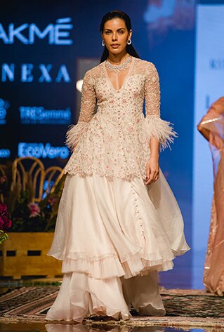 Known for beautiful prints and intricate embroider, Ridhi Mehra once again stole a million hearts with her latest collection ‘An ode to Heirlooms‘. Exploring her roots and reflecting on her family’s cultural duality, she staged a personal yet extremely powerful presentation at Lakme Fashion Week W/F ’19. While uniquely showcasing the rich culture and beautiful aesthetics of India, the collection has an interesting contemporary twist to it that seamlessly lends the signature Ridhi Mehra touch. Diana Penty played Ridhi Mehra’s Muse and walked down the runway in a gorgeous ivory lehenga that was intricately embroidered and embellished with sequins.
