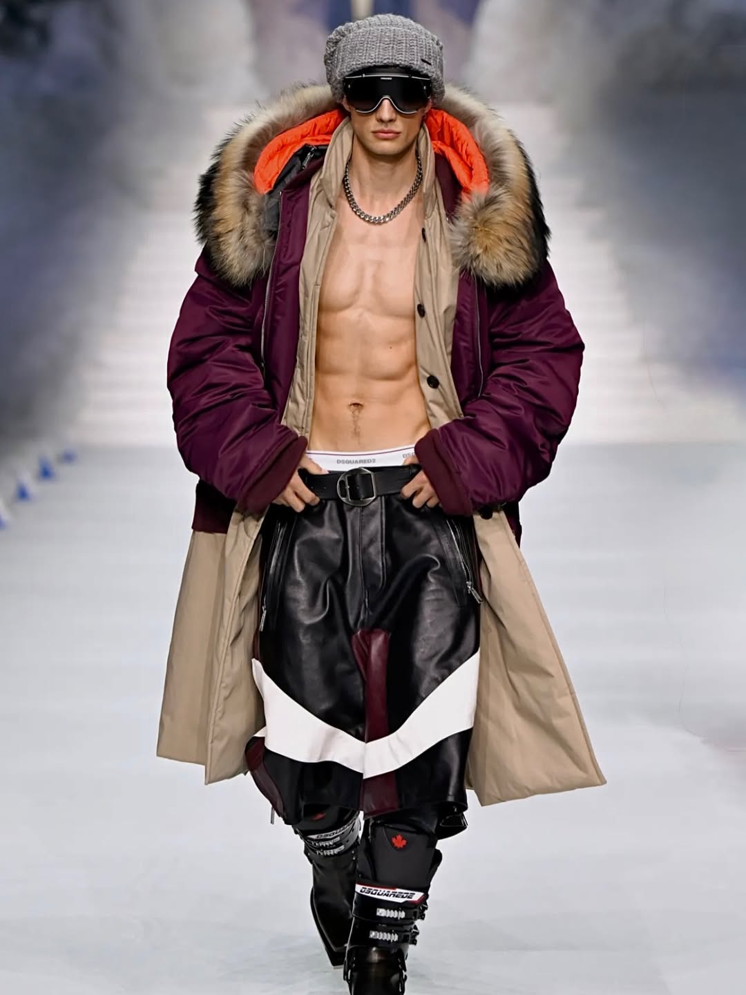 The week kicked off with an electrifying mix of dynamic theatrics and refined tailoring. Dsquared2 stole the spotlight with a run-the-slopes fantasy on the runway, complete with performance fabrics and a snowy, mountainous set that echoed winter sports culture – highlighted by Hudson Williams’ debut walk. Winter-ready silhouettes dominated the show, from oversized puffers and layered outerwear to hockey-inspired pieces paying homage to Canadian sports culture.