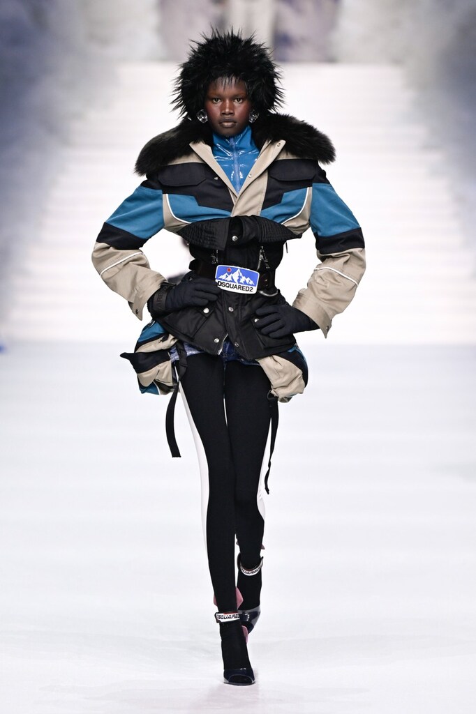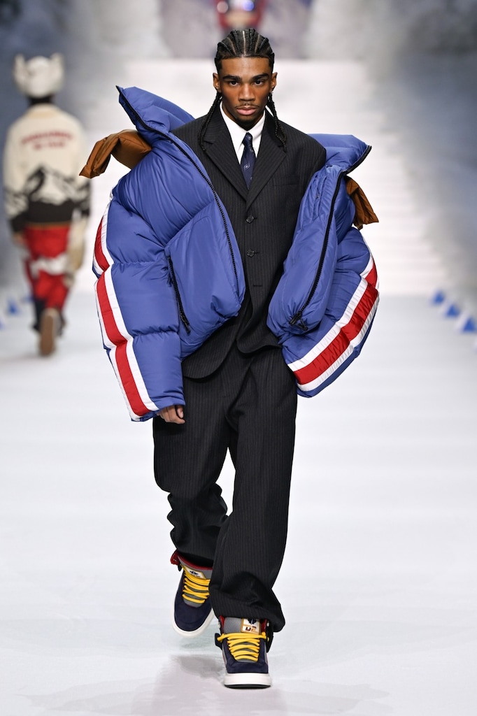 One word defined the collection: bold. Unapologetically bold. Dsquared2 pushed firmly against the tide of minimalism, leaning into exaggerated proportions and statement-led styling. Ice-skating and winter-sport references ran throughout the collection – bold underpuffs, oversized puffers, and massive parkas layered effortlessly over tailored suits, racing-inspired knits, and ski-ready underpinnings. Hockey jerseys, knitted après-ski sets, padded vests, and biker jackets blurred the line between sport and street, creating a wardrobe that felt energetic and deliberately oversized.