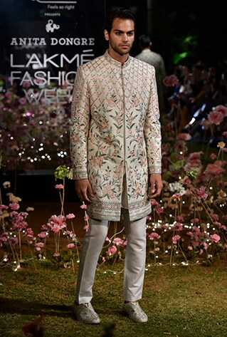 Maestro of style, designer Kunal Rawal gambled with all black and navy blue sherwanis rendering them in tonal textures and deconstructed silhouettes for his Spring/Summer ’19 collection. Unconventional and optimistic, the styles make for a perfect pick for sangeet-cum-cocktail wedding soirees. Enigmatic millennials need not away from embracing all-black this season! Anita Dongre on the other side decks her signature sherwanis in artsy flora and fauna prints for her Spring/Summer 19 collection. The old-school relaxed versions are nipped to fit the form while the length is cropped to give you a note-worthy peek at the contrasting printed kurta underneath. Jewellyn Alvares celebrates the nonchalance of Gen Z choosing monochromatic patterns that anchor the svelte quotient. These styles easily blend with eclectic destinations of a wedding, whether a resort or palatial.