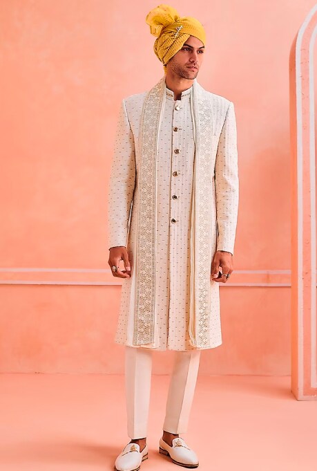 A traditional Indian wedding calls for an equally traditional outfit. And what better way to make a statement than with a Bandhgala Sherwani? The classic piece exudes refinement and elegance with its clean-cut, fitted silhouette and sleek mandarin collar. Donning a Bandhgala Sherwani on your special day will add a touch of regal charm to your overall look. It’s no wonder this style has stood the test of time and continues to be a favourite among grooms.