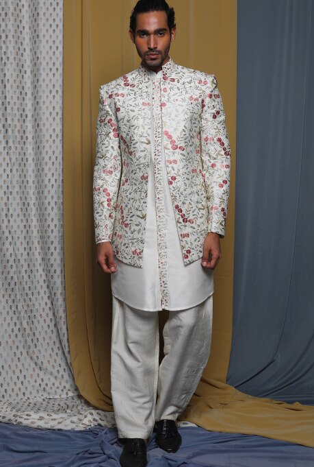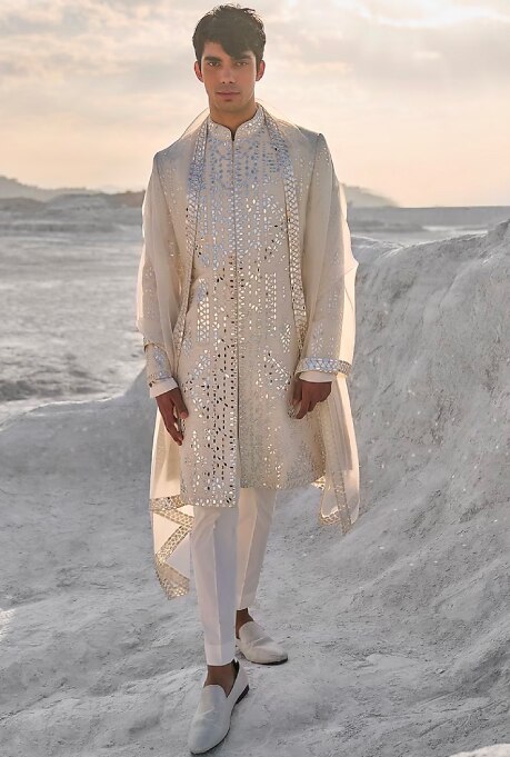 If you’re looking for a traditional yet contemporary outfit for your wedding day, consider the Achkan Sherwani. This versatile piece combines the best of both worlds. A shorter, fitted silhouette that’s perfect for grooms who prefer clean lines and minimal embellishments. Ultimately, the choice between the two comes down to personal preference and the overall aesthetic of the wedding.