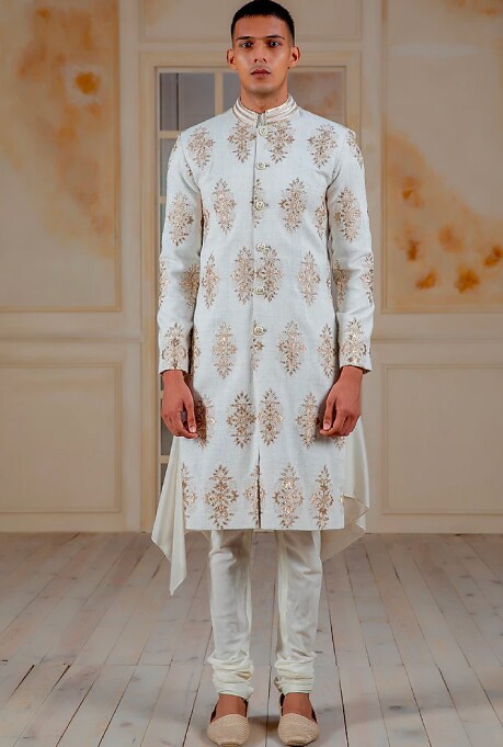 Angrakha Sherwanis offer a classic twist on traditional attire, bringing a regal and old-school feel to your big day. If you value the irresistible allure of flares and the sophisticated appeal of definitive silhouettes, these Sherwanis are the ultimate choice for you. Angrakha Sherwanis are made from high-quality materials, ensuring they are comfortable to wear and provide the perfect fit. They come in various colours and designs, allowing you to choose the best style. Angrakha Sherwanis are perfect for those who appreciate simplicity as well as those who fancy extravagant detailing.