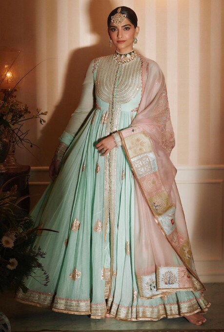 Make a splash at summertime nuptials in one of the most popular shades for bridesmaids in the West with an Indian spin! For her sister’s ceremony, Akansha Ranjan Kapoor slipped into a serene blue Lehenga crafted by Anita Dongre. Adorned with subtle cascading prints in similar hues, the asymmetrical select is perfect for twirling around in sunshine-filled daytime weddings. With a fuss-free printed ensemble like this, you’ll be able to master your BFF duties without compromising on style. Take notes from the actor and complete your look with a statement choker necklace and earrings to match.