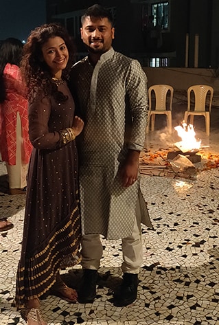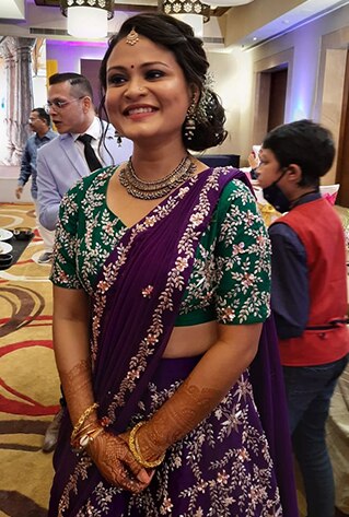 Maya, Senior Fashion Merchandiser at Pernia’s Pop-Up Shop, wore a radiant and regal toned lehenga adorned with beautiful botanical motifs, from Pink Peacock Couture for her Sangeet function. The colours, which were customised by her, were perfect for the high-energy nature of the revelries. The jewellery she paired with it stands out the most, not just for its instant charm but also for what it means.