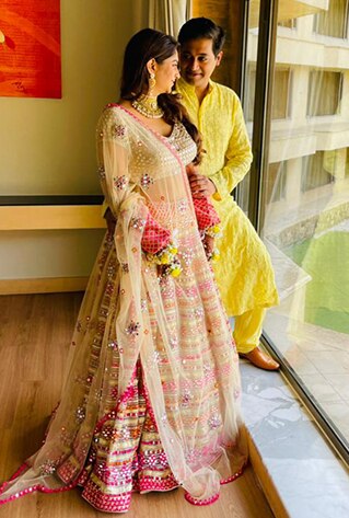 For her intimate Haldi ceremony, she chose a radiant & striking Abhinav Mishra lehenga adorned with mirror work. She was going for an elegant and classic look, and felt that an outfit from the designer would add a jolly element to the ceremony. The couple decided to turn it into a lively dancing event to make up for not being able to host a cocktail party or Sangeet function.