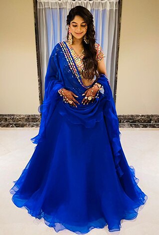 “I did not want to pick something very heavy as I was anyway going to be doing that for my main wedding day functions. So this definitely was a comfortable, easy to manage and the right choice given the occasion. The frill detailing on the dupatta lent a very contemporary element to the outfit. I paired it with statement Kundan Earrings and a delicate haath phool,” she adds.