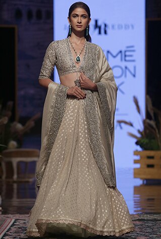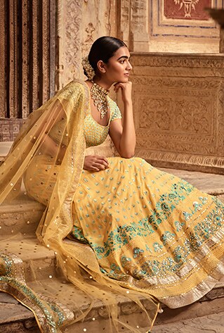 Summer is all about loving your favourite flowers and looking as fresh as them. Marigold yellow is shining sun-kissed light onto the summer wedding season of this year. A refreshing substitute for all the blushes and reds, it’s the It colour for happy baraatis. And if you’re tying the knot, nothing better than a radiant lehenga to enhance your bridal glow!