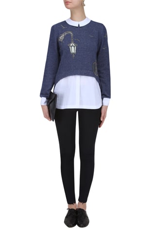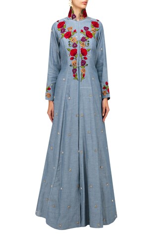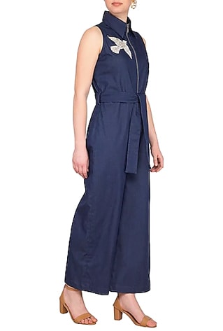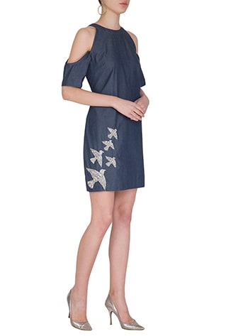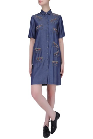 Blue Beads Embroidered Specky Eyes Motif Denim Shirt Dress