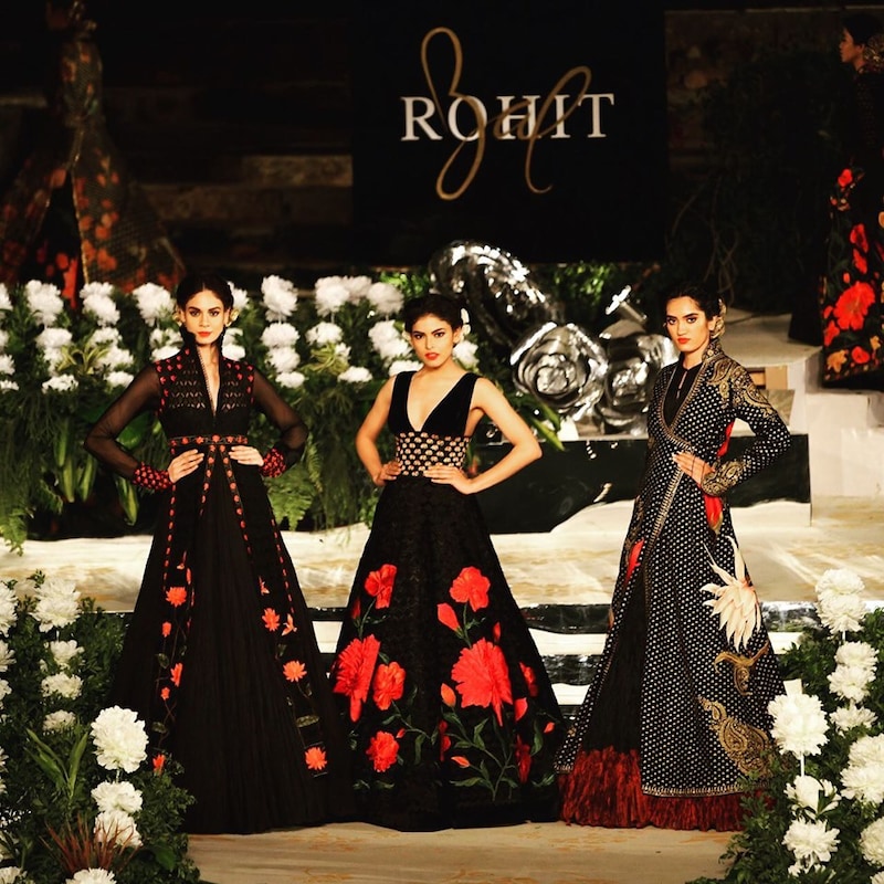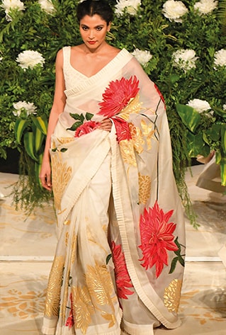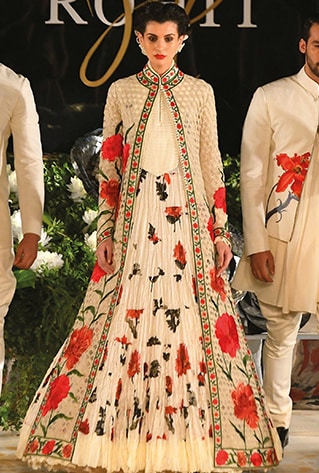 Art & versatility is the core focus of his contemporary wedding wearables. Placing supersized flowers on bewitching dark hues, he turns dreamy visuals into reality. His wedding couture defines a new take on bridal fashion every season. A new-age bride can channel her own modern individuality with a definitive flair, making a lasting impression of her big day. His artful affinity with botanical patterns is formulated in a bold tone in his collections. Whether you’re a bride-to-be or a fashion-forward wedding attendee, your wedding wardrobe isn’t complete without the dose of art illustrated in Rohit Bal lehengas, ruffle sarees, anarkalis and their indo-western hybrids.
