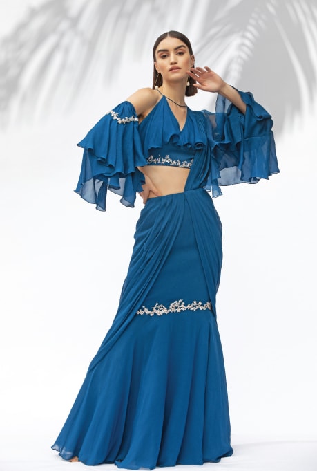 For Singhal, it has to be festive kaftans. “We have reimagined our kaftan kurta sets in bandhani, accented with our signature yokes.”Wirk stakes claim on dhoti pants with kaftan tops or tunics with an asymmetric jacket and concept saris, which she describes as easy-to-wear yet glamorous and feminine. Her current favourite is her signature drape jumpsuit, where a dupatta is draped in a variety of ways, giving uber chic Indo-Western vibes. “Think a lehenga with a white shirt or a bridal top with a pair of blue pants,” prompts Shadangule. “This is sustainable circularity,” she exclaims. Indian wear has always charmed women across the board, however its appeal has been limited in terms of events and occasions. The good news is that it’s changing. While the new-age demand is transforming the character and motifs of traditional wear to make it more modern, edgy and engaging, the ongoing digital disruptions are taking these trends to the last mile. The blend of Indo-Western, mixing and matching of styles and aesthetics and sustainability are emerging conversations in this space. Whether you are at home or going to the office, whether it’s a small event or a lavish gala, this fluidity in design and thought will definitely work in your favour. Don’t forget to add your personal touch or quirk to make these trends your very own.