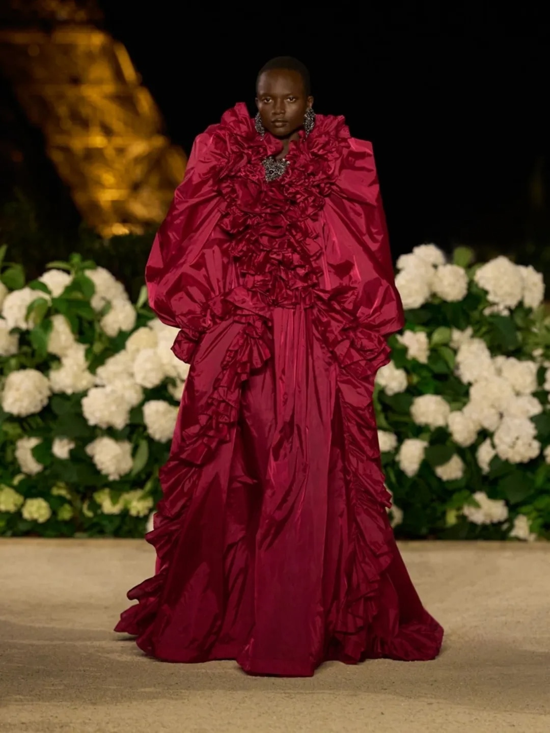Colour reigned supreme this season. Rich, luminous jewel tones – ruby reds, emerald greens, and antique golds commanded attention alongside softer hues of lilac, blush, and butter yellow. Designers brought an almost futuristic radiance to their palettes, from Saint Laurent’s sculpted gowns bathed in bold shades to Tarun Tahiliani’s shimmering silhouettes that redefined Indian luxury with a global gaze.
