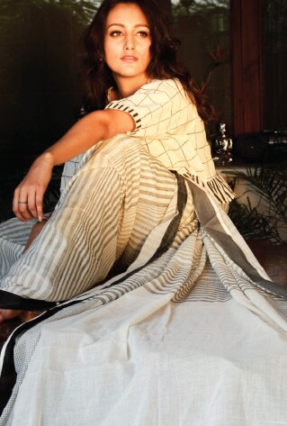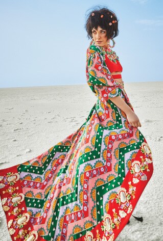 Geometric patterns get all bold and frivolous for Papa Don’t Preach . Leheriya stripes and chevron prints are rendered with OTT textures and embellishments for a futuristic flair. While Platform 9 is garnering a fanbase by pairing polka dots with stripes and checks, Latha Puttana decided to give it an ethereal touch interpreting geometry through see-through self-design on wispy handwoven fabrics.