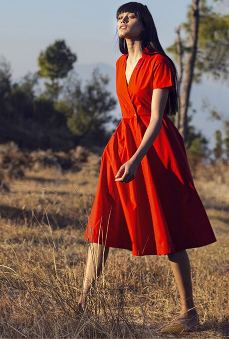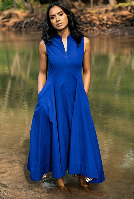 The brand Khara Kapas’ very name translates to ’’pure cotton’ in Hindi. Their design philosophy is built on minimalism and timelessness which is seen in their clean-cut dresses and fantastic use of colours. All their pieces feature vivid hues, tie-dye patterns & ethnic motifs, perfect for casual and occasion wear.