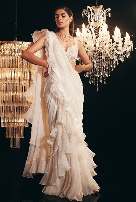 If you’re a bride-to-be or the bonafide fashionista wedding attendee, stand out from the sea of lehengas by rocking your desi avatar in a dazzling saree. Take cues from Priyanka Chopra, who gave heavy lehengas a miss for her sangeet night by opting for a silver and gold saree by Abu Jani Sandeep Khosla, setting an unconventional trend for brides-to-be. Apart from the OG desi girl, Deepika Padukone and Anushka Sharma embraced the nation’s rich culture adorning Benarasi saree for their reception appearances. Designer sarees are no longer reserved for curated bridal trousseau but also shine through grand gala affairs. From ruffle sarees to lehenga sarees, the latest designer collections include a range of eclectic concept sarees to make their way into destination weddings this year.