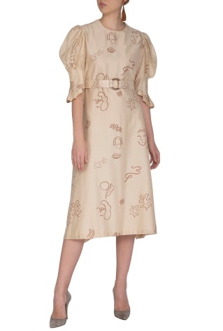 Befriending shorter hems is a ninja way to rain-proof your look. This form-accentuating midi dress is a perfect pick to move out to work in the unpredictable weather. The doodle print and statement sleeves are the star element to pack panache!