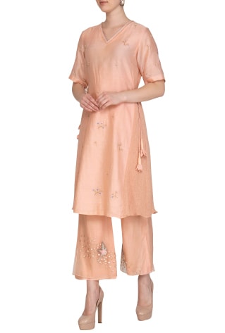 You’ll easily give any dress amiss to adorn this divinely comfy and preppy kurta set on a work day, The dainty flower accents and the cigarette style pants are equal parts stylish and purposeful for a drizzly day!
