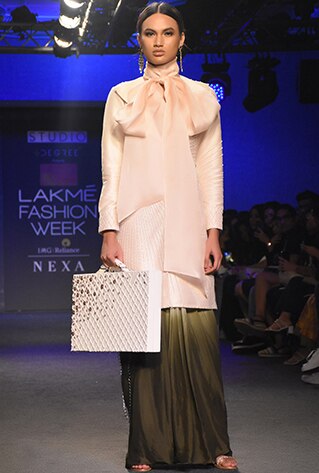 One supersized accent can shine off as the hero element of any demure outfit. Adding dollops of drama to the Victorian vintage pussy bow to the next level, Pink Peacock Couture followed the red-carpet wave of this season. Couturier Amit GT on the other hand, displayed impeccable origami with ostentatious flowers on the bustier of his gowns. If you’re the belle of every evening affair, bid on big accents to reinstate your fashionista status. Bloni brought their street-style power play with a pair of detachable woollen sleeves that were teamed with a saree-bustier set. Think about strapping them on for a cocktail after-party to take the ante up by a notch!