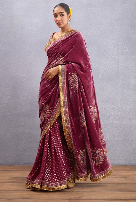 Looking for a break from traditional silk sarees? Velvet sarees are the way to go, as they possess distinctive charm; these unique ensembles are all about texture, elegance, and richness. These sarees have a way of clinging to the body that feels like a dream, emphasising your curves in all the right places. There is an array of shades to choose from, like wine purple, maroon, and bottle green if you’re heading to a grand occasion. Have a look at designers like Torani, Divya Aggarwal, Priyanka Jain, and RI Ritu Kumar, among many others, to find a velvet saree that fits your style.
