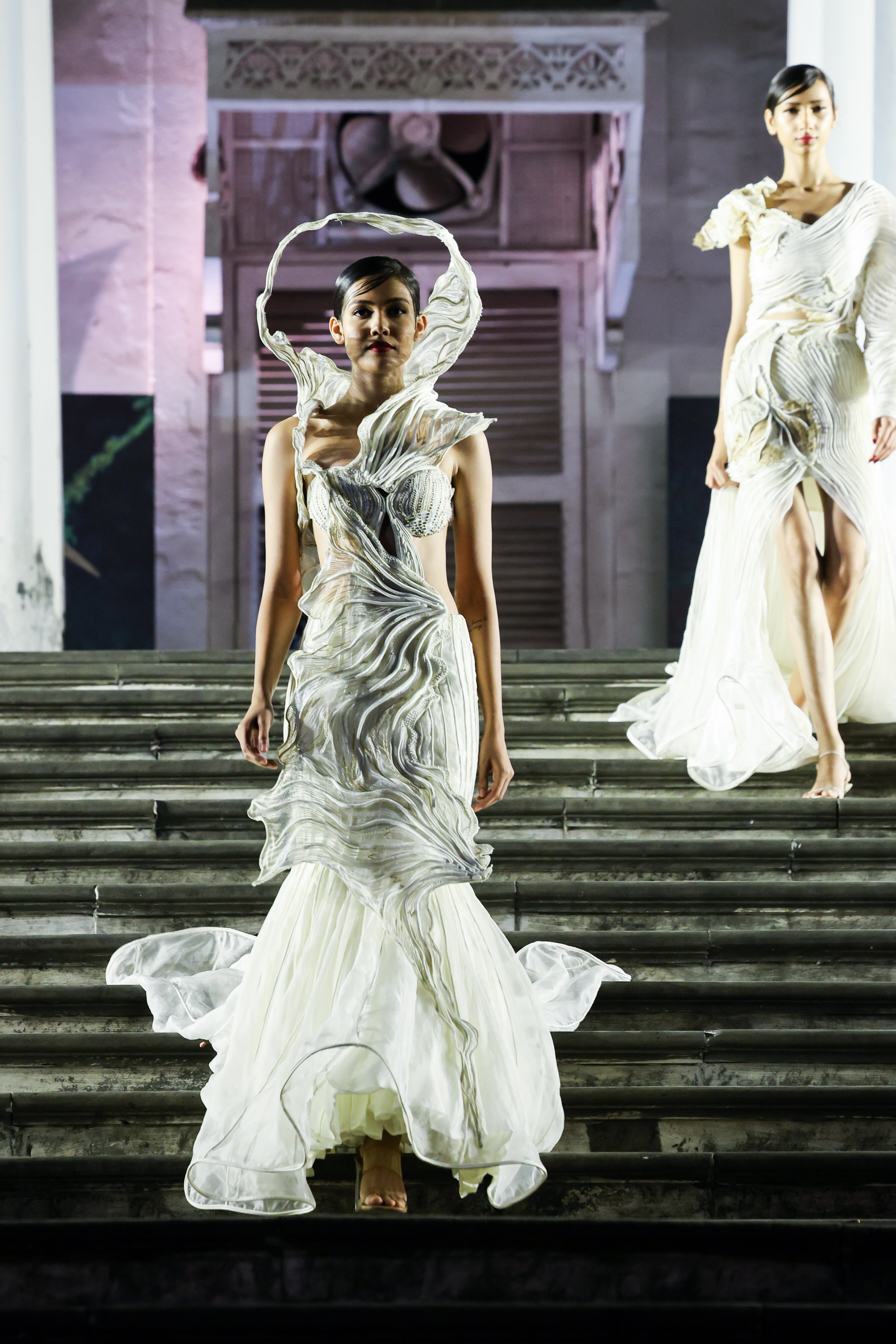 Instead of introducing newer techniques and forms, the designer revisited some of her signature cording textures, abstract forms and fluid pleats as a tribute to her 25 years of couture excellence.