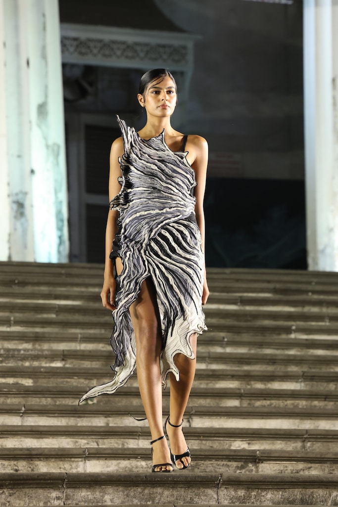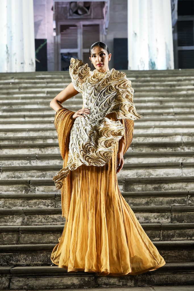 A diver herself, Vaishali’s silver jubilee collection became a rhythmic ode to the oceans – with sculptural silhouettes mirroring the ebb and flow of waves, and the intricate geometry of coral reefs.