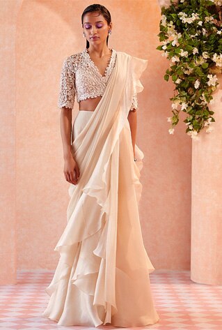 Reviewing the trend charts, the pre-draped ruffle-accented sari has been in the spotlight season after season, garnering the most-coveted concept sari title. Like experimenting? The runway has witnessed the drapery in a myriad of deconstructed styles that will appeal to both maximalists as well as minimalists.